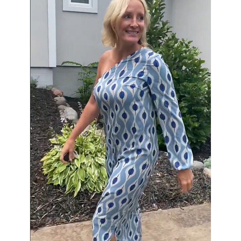 Women's Casual Dress Shift Dress Geometric Print One Shoulder Maxi long Dress Casual Daily Vacation Long Sleeve Summer Spring