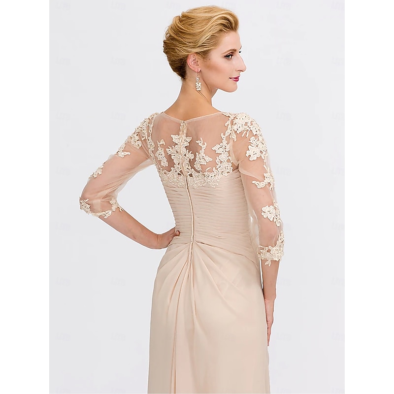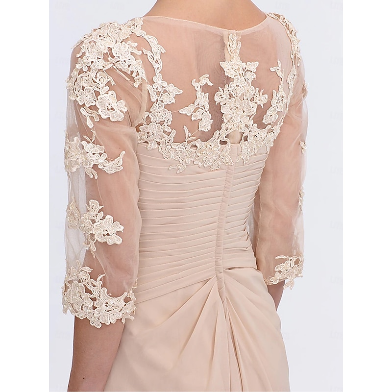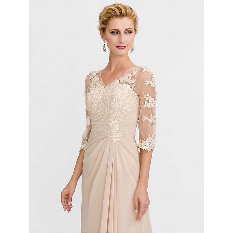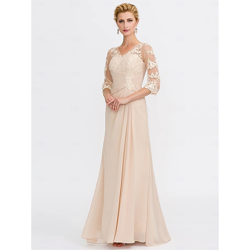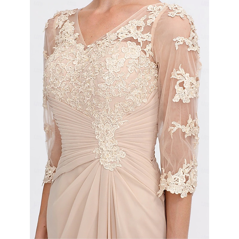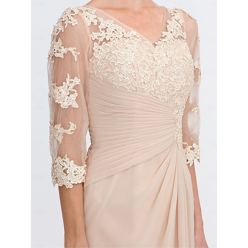 More information about A-Line Mother of the Bride Dress Wedding Guest Elegant Plus Size See Through V Neck Floor Length Chiffon Half Sleeve with Appliques Side Draping
