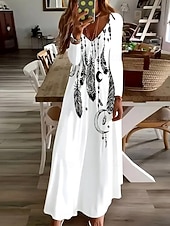 HOT ! Women's Maxi long Dress White Dress Casual Dress A Line Dress Bohemia Vintage Stylish Holiday Loose Fit Ombre Graphic Feather Long Sleeve V Neck White Spring Fall Winter