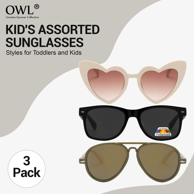 OWL Kid's Assorted 3 Pack Sunglasses – UV Protection Heart, Polarized Retro, Stylish Aviator Sunglasses for Boys and Girls 3