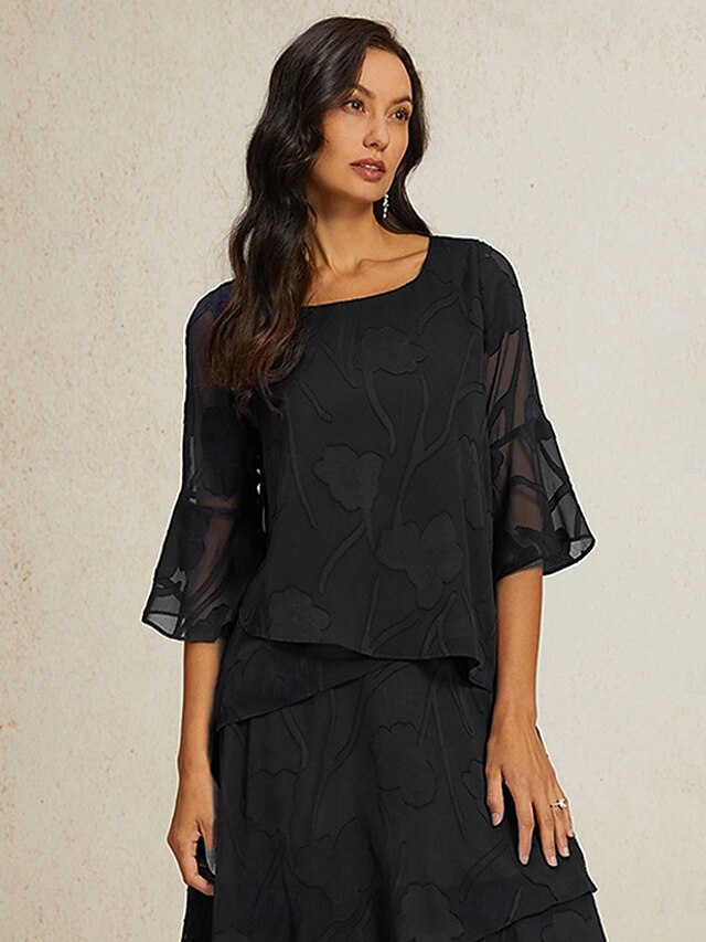More information about Women's Lace Shirt Blouse Dressy Tops Chiffon Tops Solid Color Floral Elegant Stylish Basic 3/4 Length Sleeve Bell Sleeve Boat Neck Regular Tops Wedding Guest Work Daily Cut Out Asymmetric Hem Black