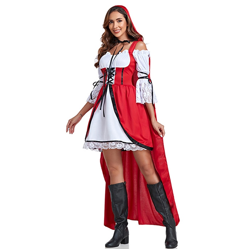 Inspired by classic fairy-tale aesthetics, each costume features a hooded red cape that adds an iconic touch. Additional design elements include black lace-up detailing for an adjustable fit, Victorian-style floral patterns, and peasant-style off-shoulder sleeves with intricate lace trims, creating a combination of vintage charm and modern allure.