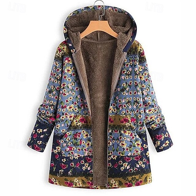 More information about Women's Fleece Jacket Coat Hoodie Jacket Warm Comfortable Zipper Pocket Fashion Modern Casual Floral Going out Weekend Zipper Regular Hooded Regular Fit Long Sleeve Outerwear Blue Green Winter
