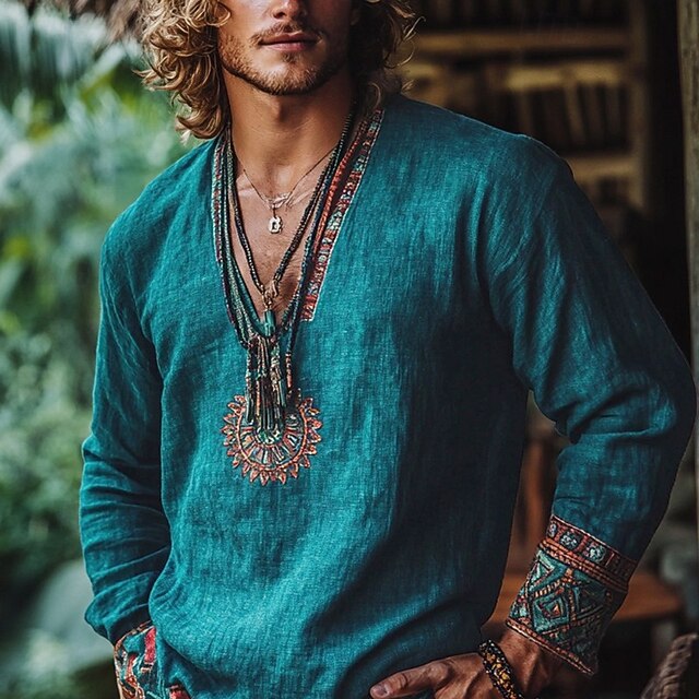 Men's Shirt Popover Shirt Summer Shirt Beach Shirt Patchwork Vacation Holiday Blue Long Sleeve Collarless Summer Spring Clothing Apparel Ethnic 7