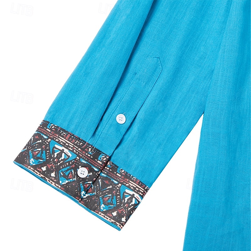 Men's Shirt Popover Shirt Summer Shirt Beach Shirt Patchwork Vacation Holiday Blue Long Sleeve Collarless Summer Spring Clothing Apparel Ethnic 9