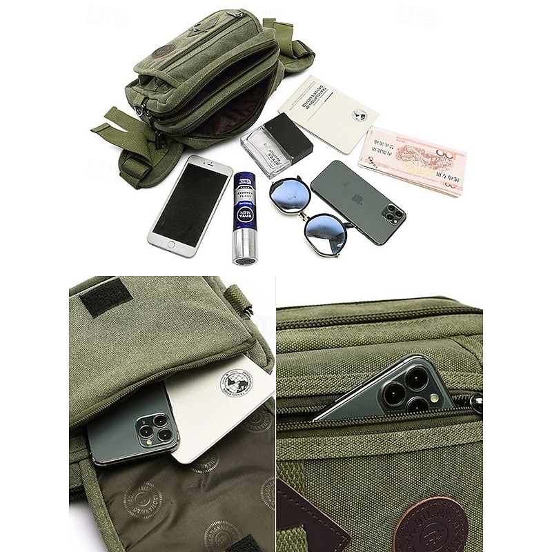 Men's Durable Canvas Crossbody Bag with Multiple Pockets – Casual Outdoor Shoulder Bag for Travel, Hiking and Daily Use Black Army Green Brown 17