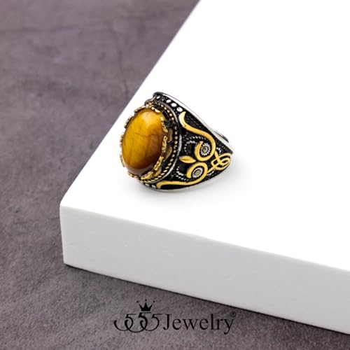 • Elegant and Ornate Stainless Steel Rings: This men's rings features a stunning oval-shaped tiger's eye stone, framed by intricate gold-colored embellishments and patterns on a textured black and gold base. The combination of this mens ring vintage-inspired elements and bold details makes it a standout decorative rings for men fashion.