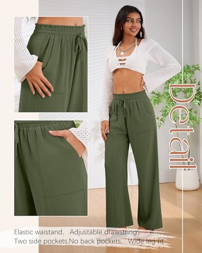 2 Pack Women's Linen Pants Summer Wide Leg Drawstring Elastic Waist Pant Casual Loose Fit Beach Trousers with Pockets(Army Green, Black,Medium) 5