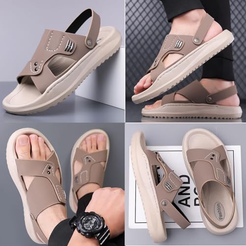 HOT ! Men'S Leather Flat Beach Sandals With Adjustable Dual Use Ankle Straps Summer Slip-On Casual Sandals Lightweight Breathable Non-Slip Slippers