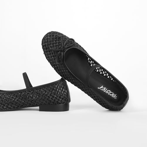 Mesh Ballet Flats for Women Woven Raffia Round Toe with Bow Ballerina Flats Mary Jane Slip On Ladies Casual Strap Dress Shoes 7