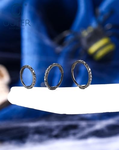• Spooky Halloween-Themed Clicker Hoop – This edgy black cubic zirconia clicker ring features a row of jet-black CZ stones set against a matte black background, creating a perfect Halloween piercing look for nostril hoops, lip rings, or cartilage jewelry.