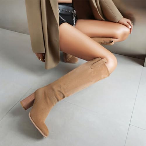 HOT ! AIJIVOU Women's Knee High Boots Chunky High Heels Classic Suede Mid Calf Boots with Chain Round Toe Pull On Fashion Buckles Dressy Boot Sexy Boot