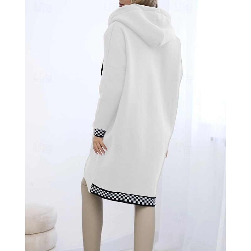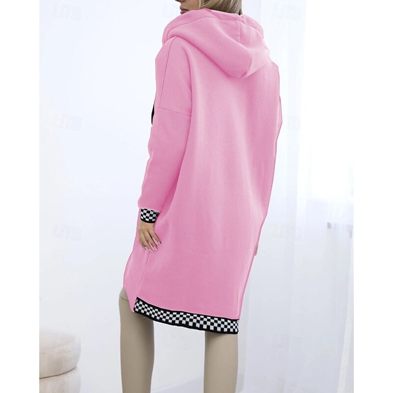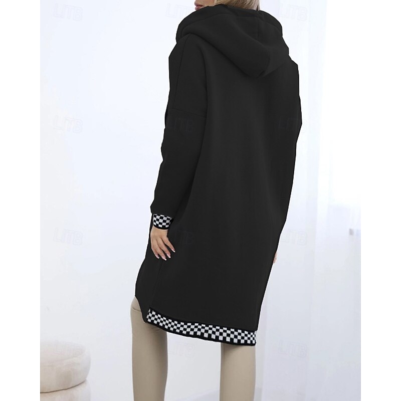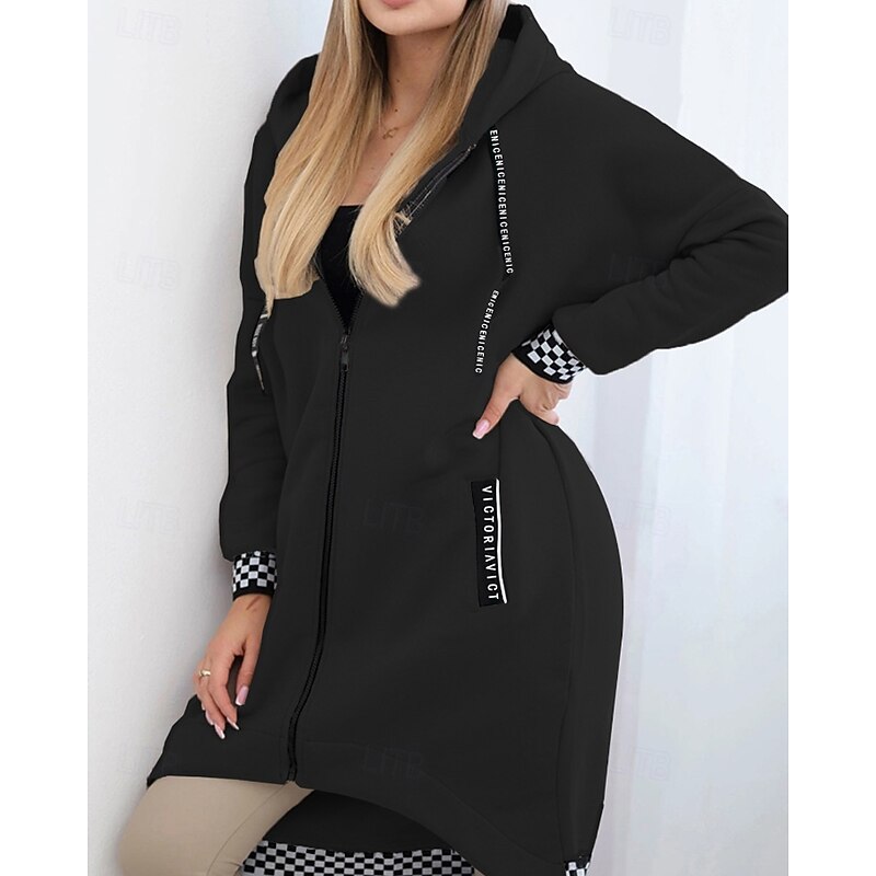 Women's Trench Coat Hoodie Jacket Warm Comfortable Zipper Pocket Irregular Hem Casual Plaid Vacation Going out Weekend Long Hooded Loose Fit Long Sleeve Outerwear Black White Pink Fall Winter 2