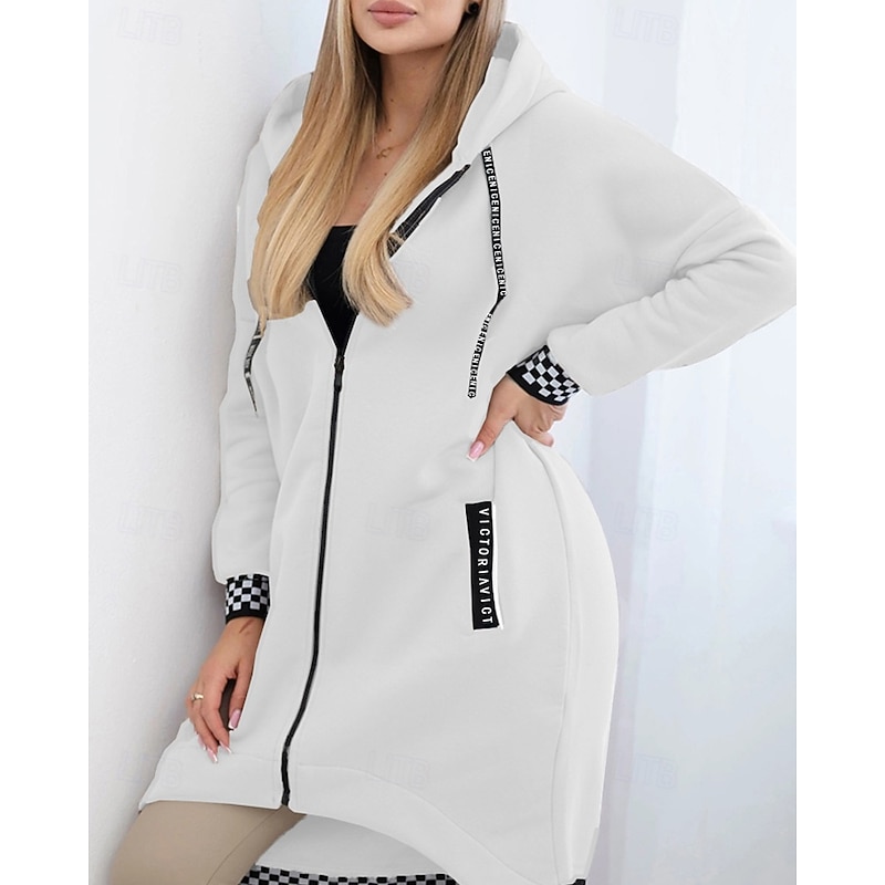 Women's Trench Coat Hoodie Jacket Warm Comfortable Zipper Pocket Irregular Hem Casual Plaid Vacation Going out Weekend Long Hooded Loose Fit Long Sleeve Outerwear Black White Pink Fall Winter 15