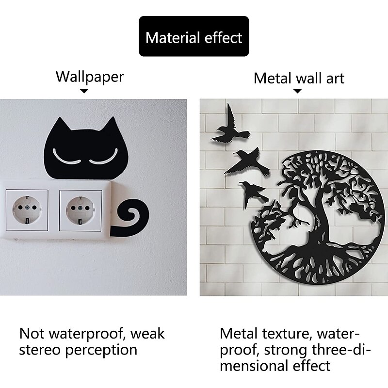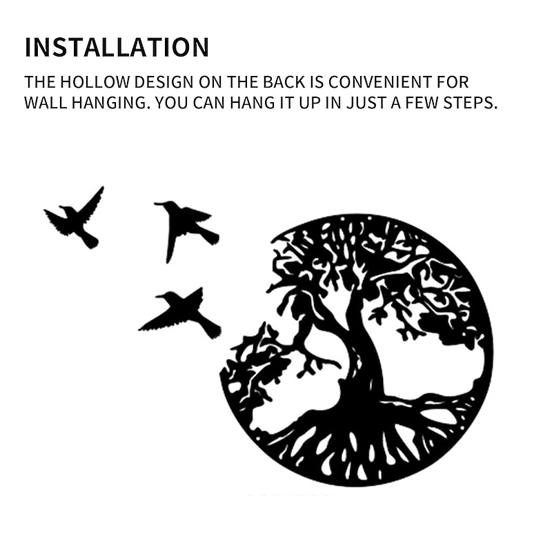 Highlights 1. The "Tree of Life" symbolizes eternity, connecting heaven and earth, and eternal life. 2. This gorgeous artwork serves as a reminder that life is always by your side, offering opportunities to appreciate nature and enhance your creativity, health, and quality of life. 3. The wall decor is conveniently sized at 28 x 28 x 0.8 cm/11.02 x 11.02 x 0.31 inches, making it the ideal decoration for any space. 4. The metal wall decor is crafted using recycled metal material and features exquisite cutting technology with no burrs, as well as a high-grade black coating that keeps it looking new for longer. 5. This beautiful piece of decor makes a perfect gift for newlyweds, friends and family, and for décor in homes, offices, kitchens, entrances, garages, and more.