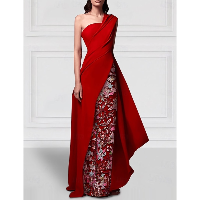 Sheath / Column Evening Gown Elegant Dress Formal Wedding Floor Length Sleeveless One Shoulder Stretch Crepe with Glitter Ruffles Embroidery 1