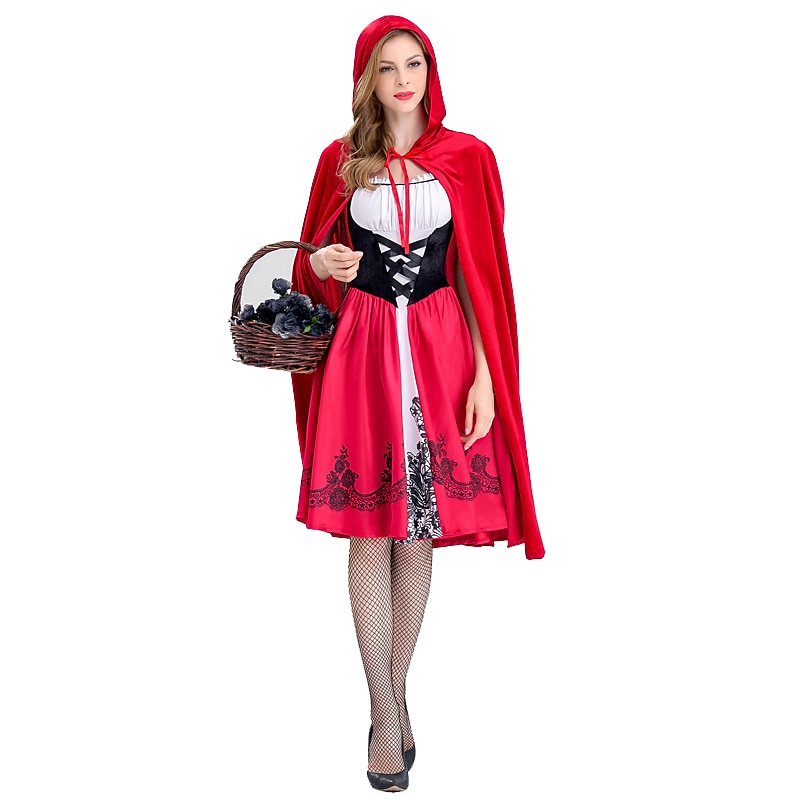 Highlights [Fabric] : Crafted from high-quality elastane and tactel materials, this Little Red Riding Hood costume offers a micro-elastic fit for enhanced comfort. The vibrant red polyester cape is lightweight yet durable, providing a luxurious feel and elegant drape. [Silhouette] : The dress is styled with a flattering A-line skirt that enhances ease of movement. The fitted bodice features vintage-inspired lace-up details and contrasting white panels, cinching the waist to create an hourglass silhouette. [Design Highlights] : This cosplay costume includes a classic red hooded cape that beautifully complements the charming black and white dress. The delicate black lace trim at the hem of the skirt adds a touch of enchantment, making it perfect for bringing fairy tales to life. [Occasions] : Ideal for Halloween, Christmas, Carnival, Mardi Gras, or any themed parties. This costume embodies the perfect blend of classic fairy tale allure with modern chic, making it a standout choice for various festive celebrations. [Size Options] : Available in sizes S, M, L, and XL, ensuring the perfect fit for different body types. This costume is designed for adult women looking to embody the whimsical charm of Little Red Riding Hood.