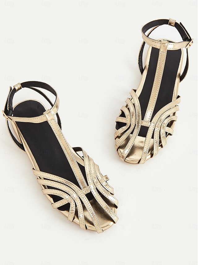 Women's Gold Strappy Flat Sandals with Ankle Strap, Elegant Summer Shoes for Weddings, Parties, and Casual Wear 1
