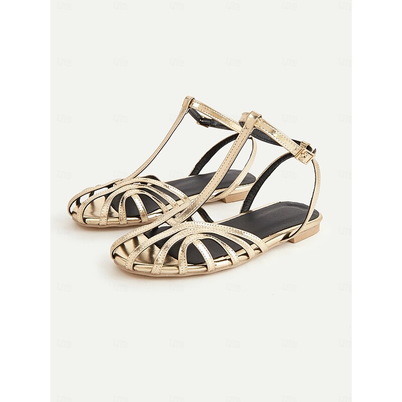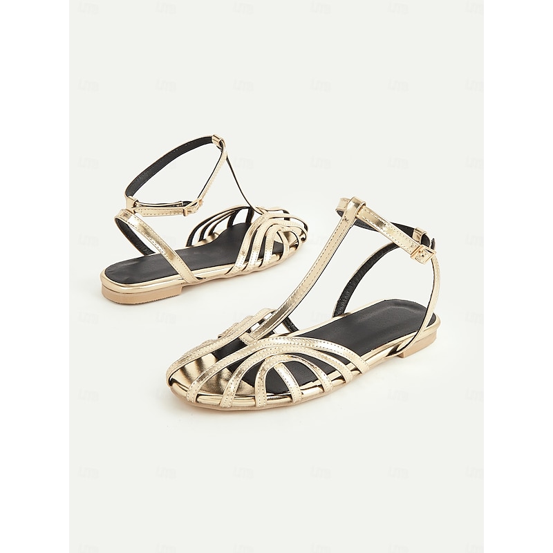 HOT ! Women's Gold Strappy Flat Sandals with Ankle Strap, Elegant Summer Shoes for Weddings, Parties, and Casual Wear