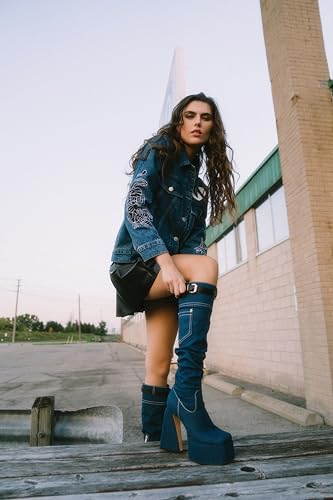 richealnini Platform Heel Knee High Boots for Women Side Zip Up Block Heels Denim Boots 4