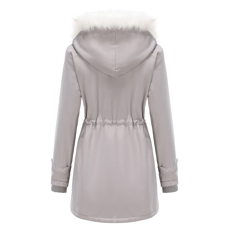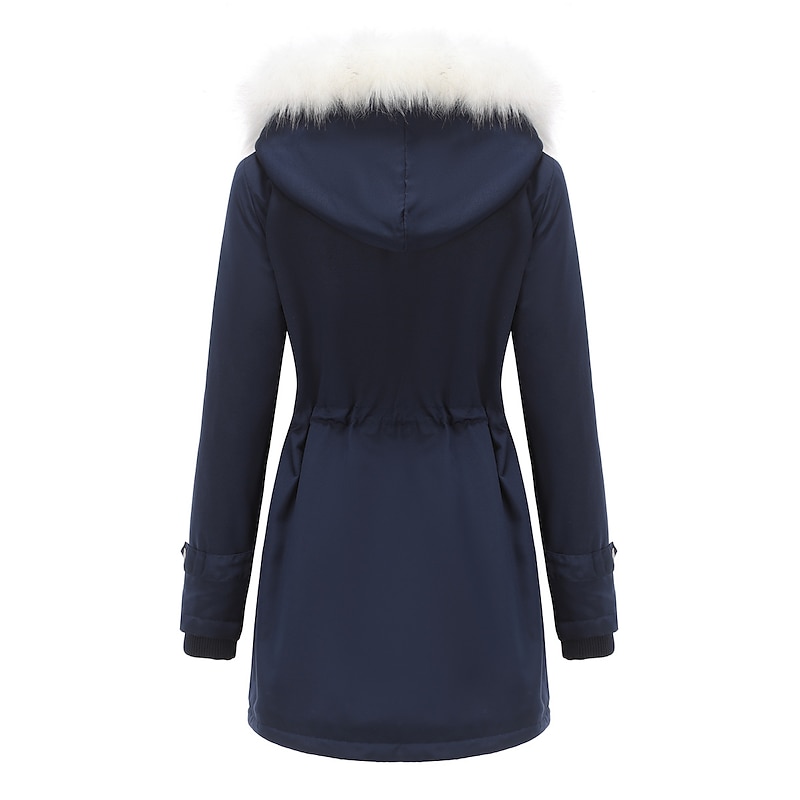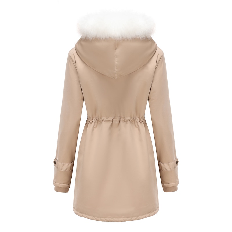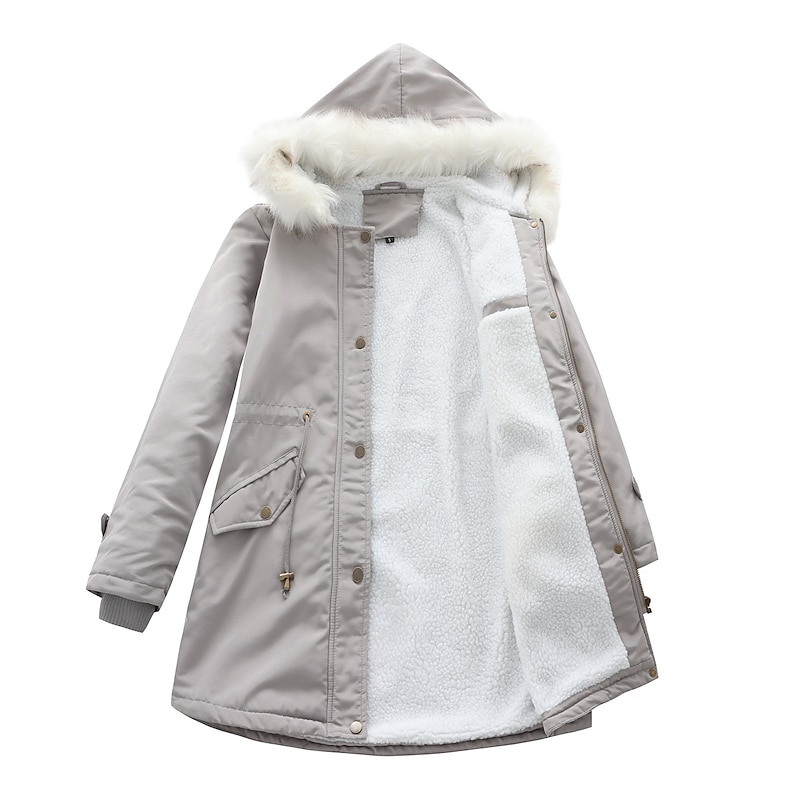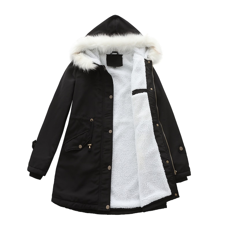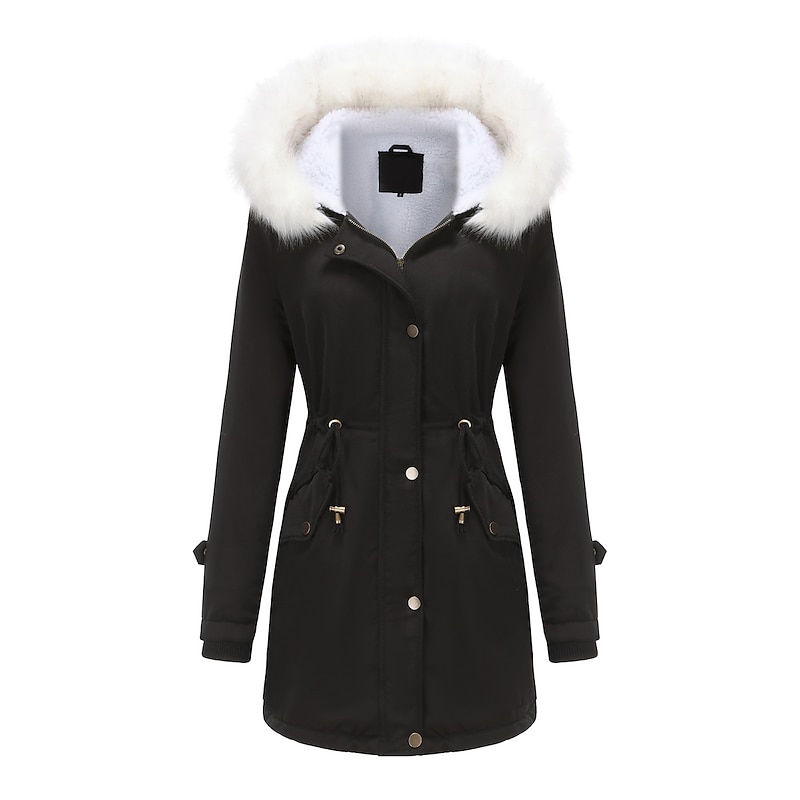 Highlights [Fabric] : Crafted from durable polyester, this women's parka jacket is designed to withstand winter elements. The polyester fabric offers windproof protection and a cozy, thermal warm fleece lining, making it ideal for brisk outdoor activities. [Fit] : This winter parka features a classic mid-thigh length that provides full coverage and comfort. The adjustable drawstrings at the waist allow wearers to achieve a more personalized and flattering fit. [Design Highlights] : The jacket boasts a chic design with a dark outer shell, perfect for harsh weather conditions. It includes a luxurious white faux fur lining around the hood, adding a touch of elegance. The parka is equipped with a concealed zipper closure, complemented by snap-button fasteners, ribbed cuffs to keep the cold out, and spacious front pockets with button closures for practicality. [Occasions] : Suitable for a variety of outdoor activities such as fishing, traveling, winter sports, camping, hiking, and caving. Whether you're on an adventurous hike or simply enjoying a chilly outdoor event, this parka provides warmth and style. [Sizes] : Available in a wide range of sizes, from S to 5XL, catering to various body types and ensuring a comfortable fit for everyone.