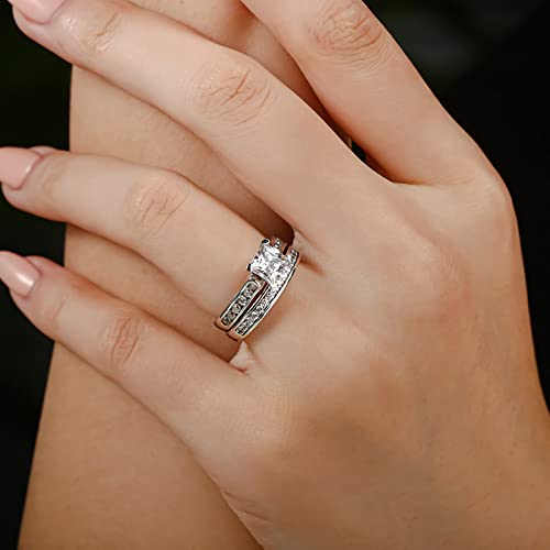 • 【RING DESIGN】This bridal ring set includes an engagement ring with a dazzling princess cut moissanite center stone, surrounded by smaller moissanite accents for added brilliance, along with a matching wedding band for a coordinated look on your special day.