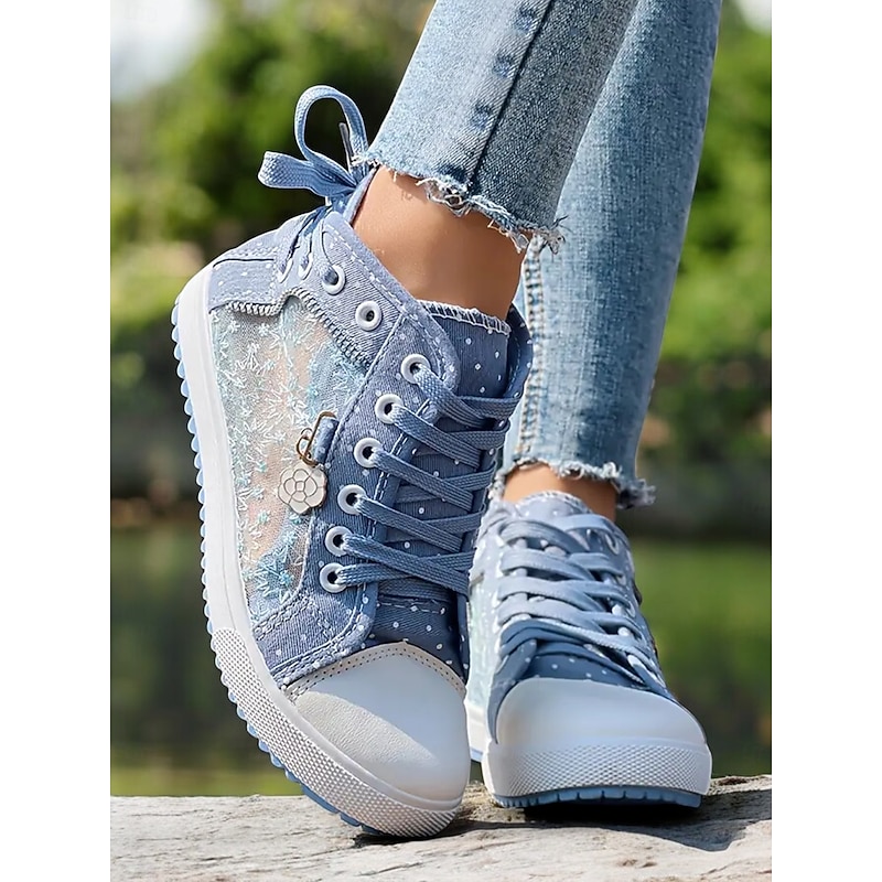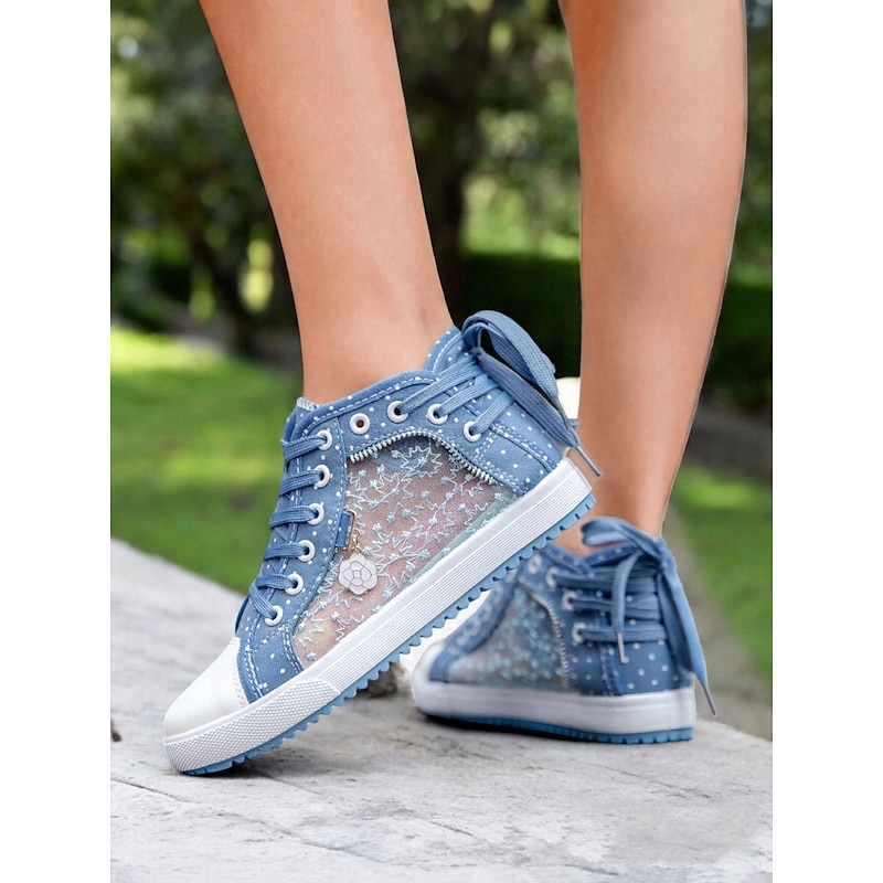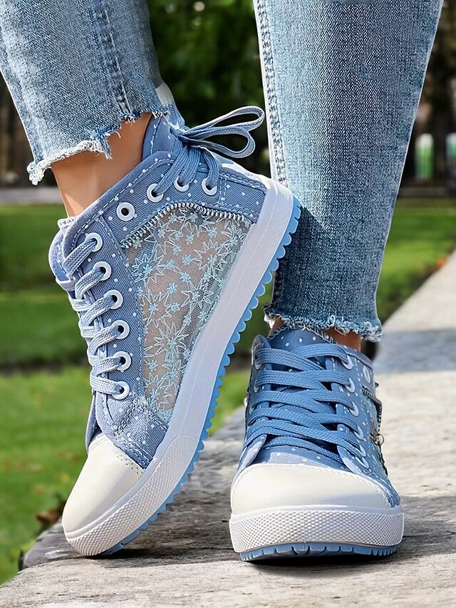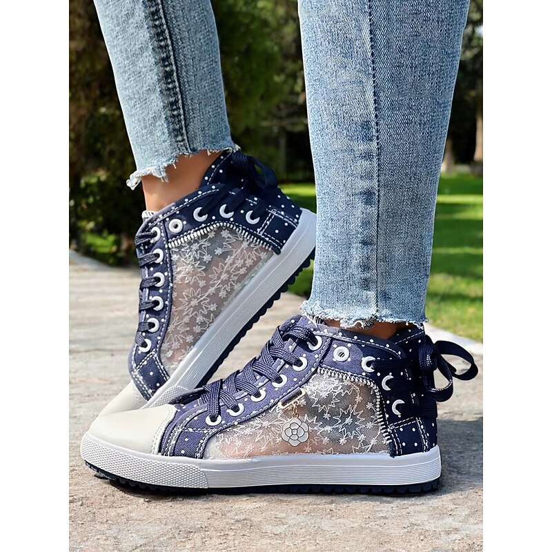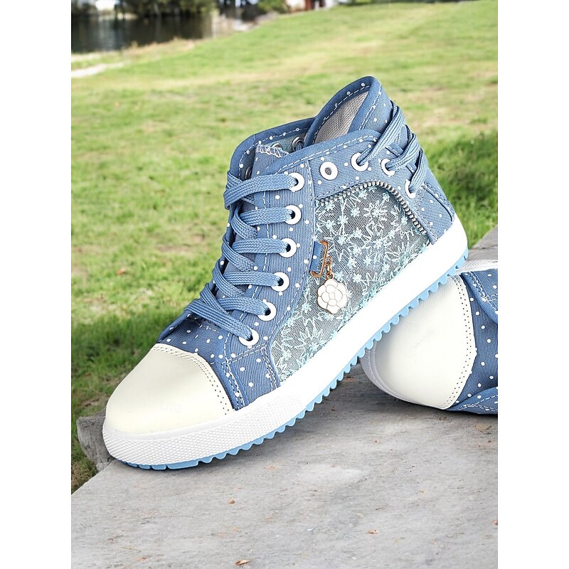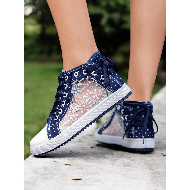 HOT ! Women's Blue Lace-Up High-Top Canvas Sneakers with Embroidered Mesh Panels, Polka Dot Design for Casual and Outdoor Wear