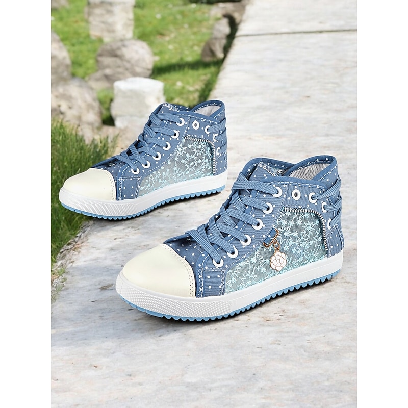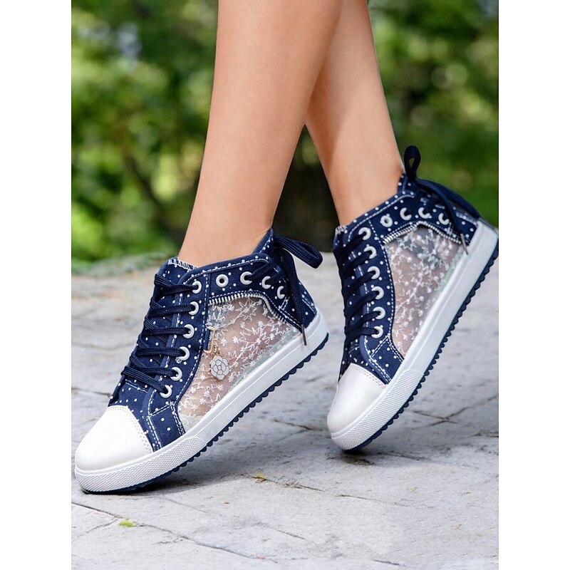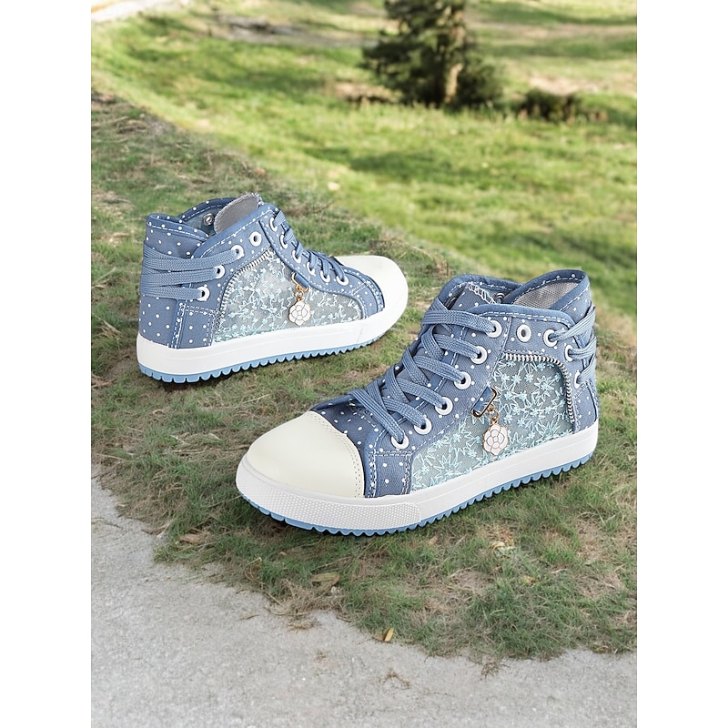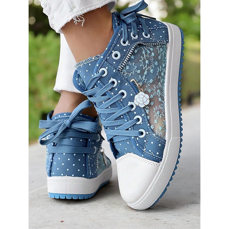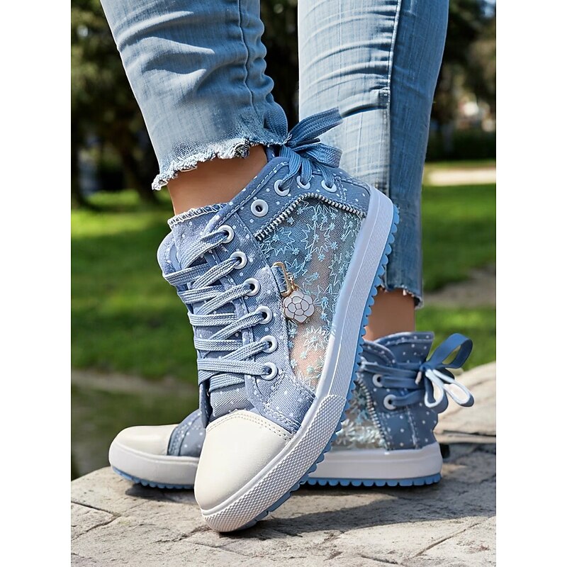 HOT ! Women's Blue Lace-Up High-Top Canvas Sneakers with Embroidered Mesh Panels, Polka Dot Design for Casual and Outdoor Wear