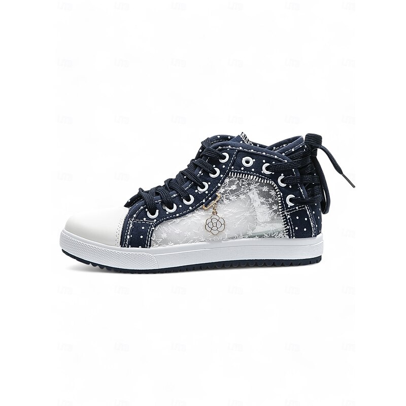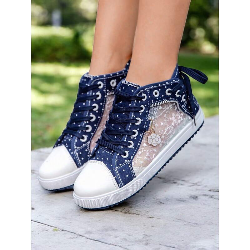 More information about Women's Blue Lace-Up High-Top Canvas Sneakers with Embroidered Mesh Panels, Polka Dot Design for Casual and Outdoor Wear