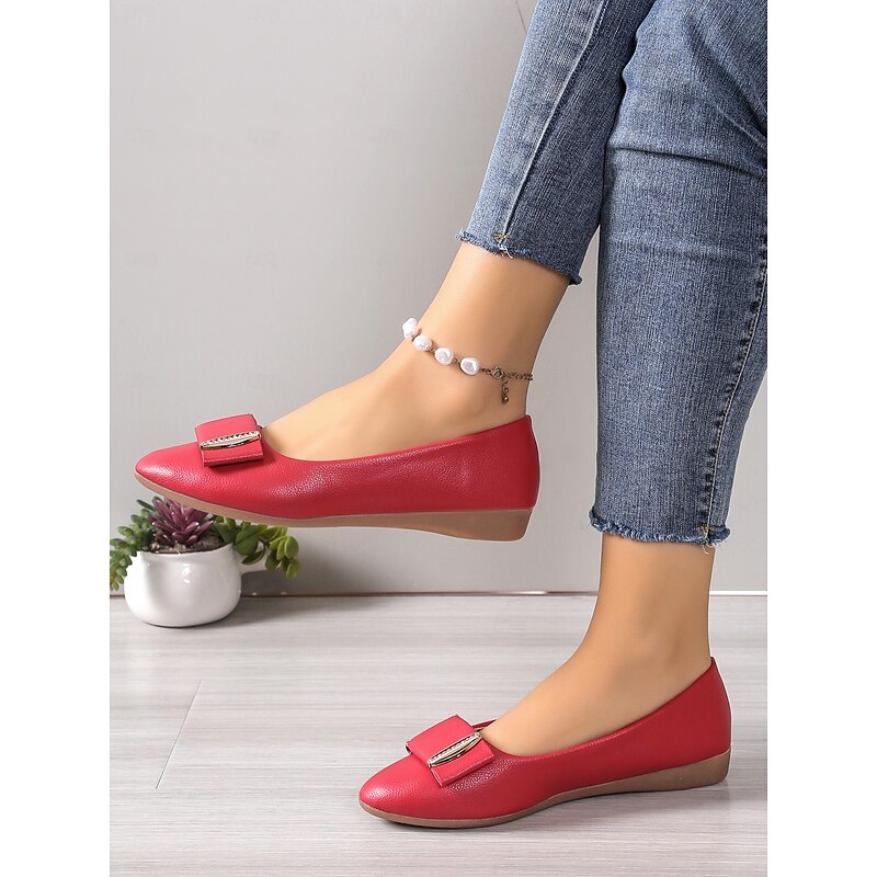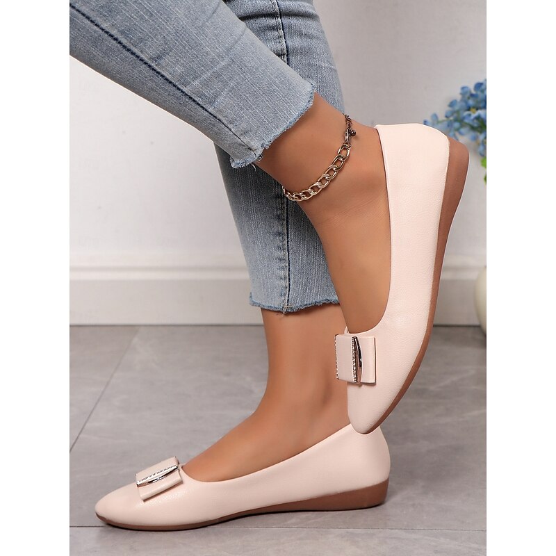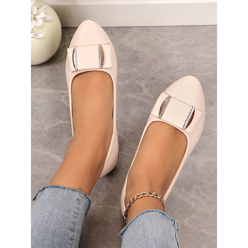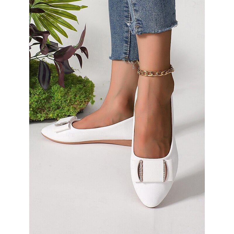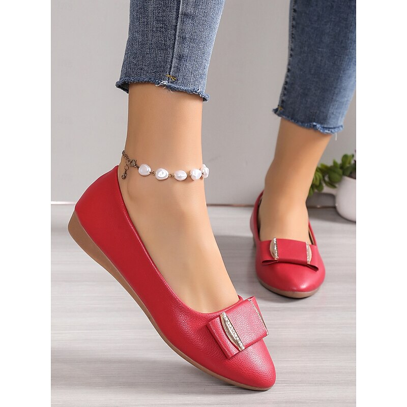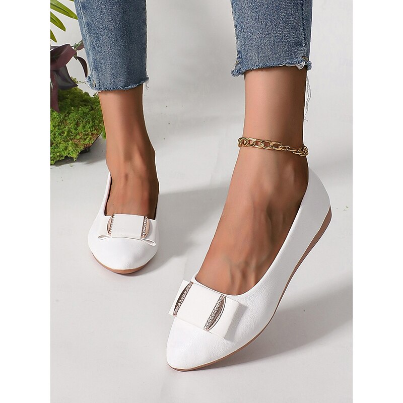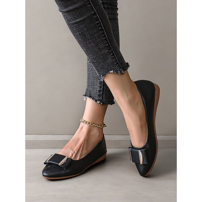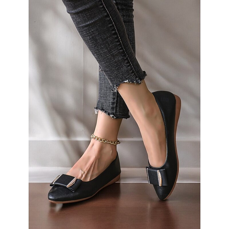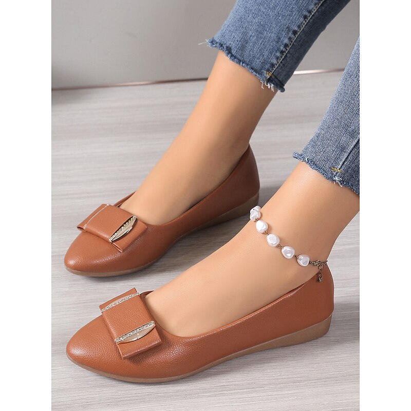 HOT ! Women's Brown Faux Leather Pointed-Toe Flats with Bow and Rhinestone Detailing - Casual and Office Wear Shoes