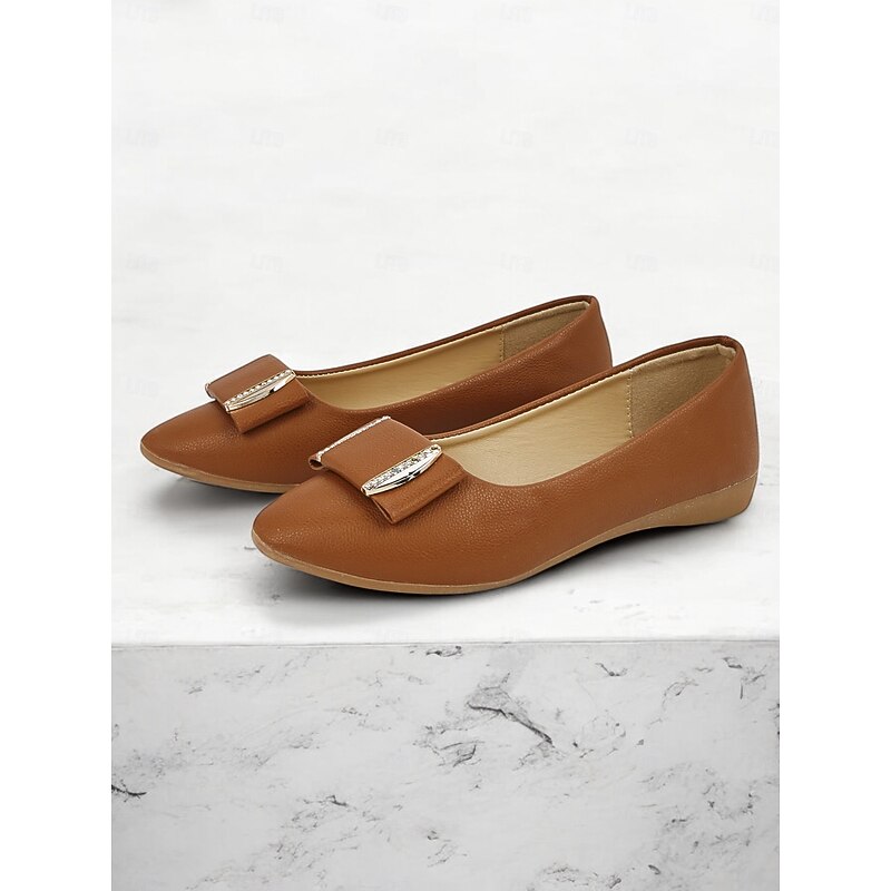 Women's Brown Faux Leather Pointed-Toe Flats with Bow and Rhinestone Detailing - Casual and Office Wear Shoes 1