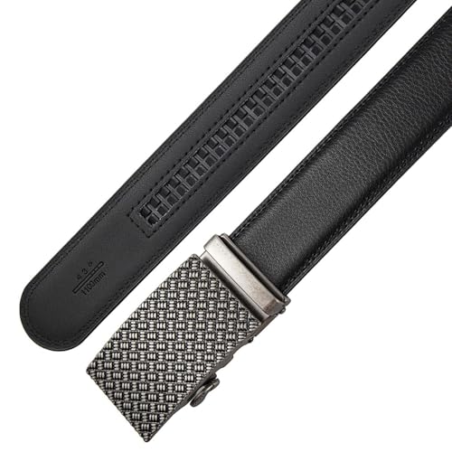 • EFFORTLESS TO USE: Experience the ultimate convenience with our leather belt. Simply slide it into the sliding buckle, pull it through, and the click-it buckle automatically locks in place. Releasing the belt is just as easy - gently push the lever on the side of the automatic buckle, and the lock snaps shut. Enjoy the seamless simplicity and smoothness of our ratchet belt design.