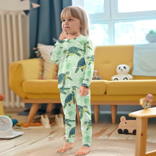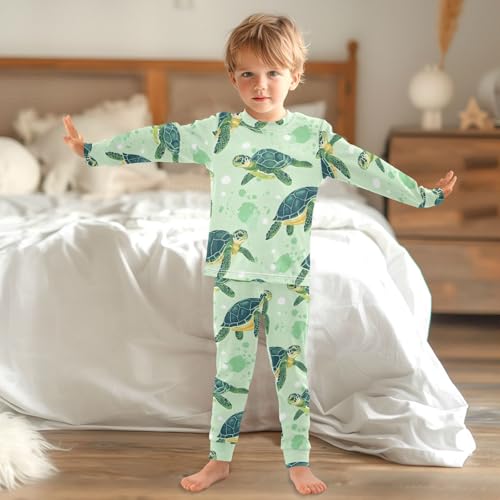 Pajama Sets Long Sleeve Cute Sea Green Turtle Pattern Soft Comfy Sleepwear 2 Piece PJS 3-8T 2