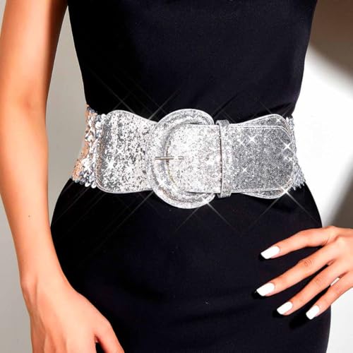 COSYDAYS Sequin Wide Corset Belt Silver Elastic Dress Belts Fashion Stretchy Waistband Accessories for Women 5