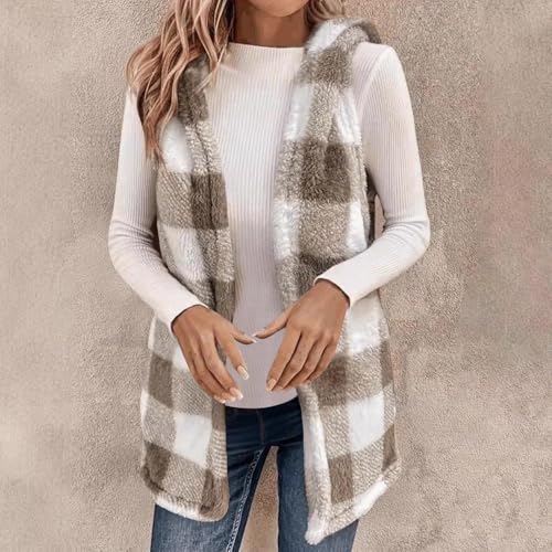 Fleece Sweater Vest Women Casual Sleeveless Sherpa Jacket Flannel Plaid Fuzzy Cardigan Warm Fall Winter Hooded Outerwear 4