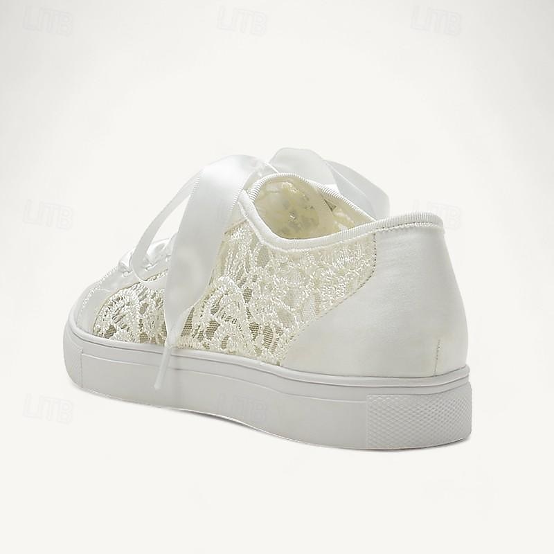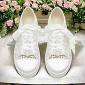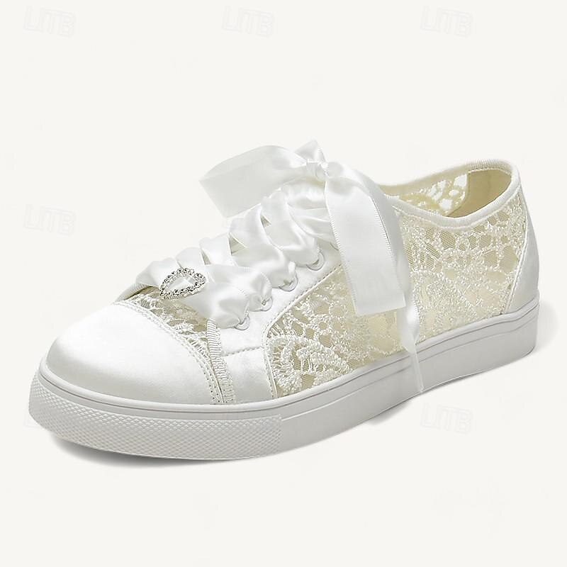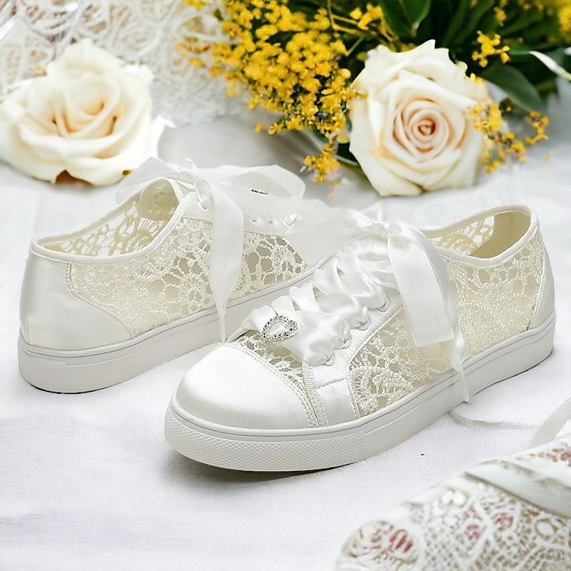 HOT ! Women's Lace Wedding Sneakers with Ribbon Laces - White Bridal Flat Shoes for Comfort and Style