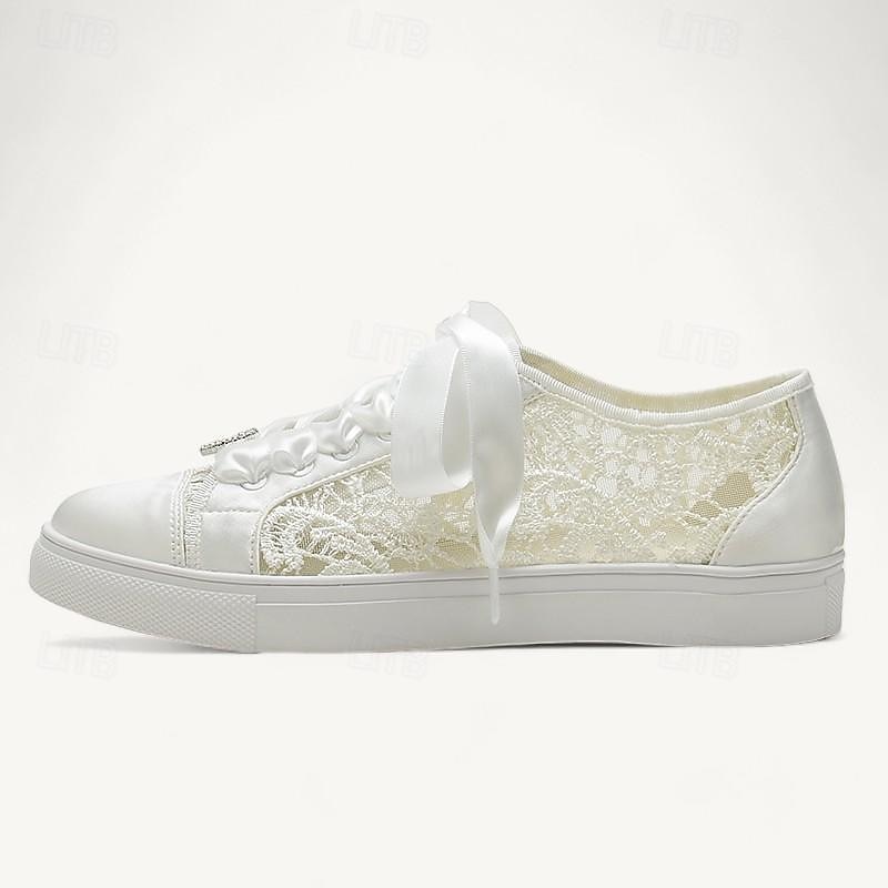 Women's Lace Wedding Sneakers with Ribbon Laces - White Bridal Flat Shoes for Comfort and Style 1
