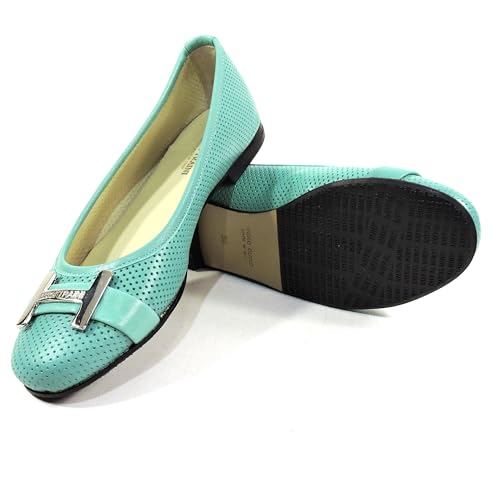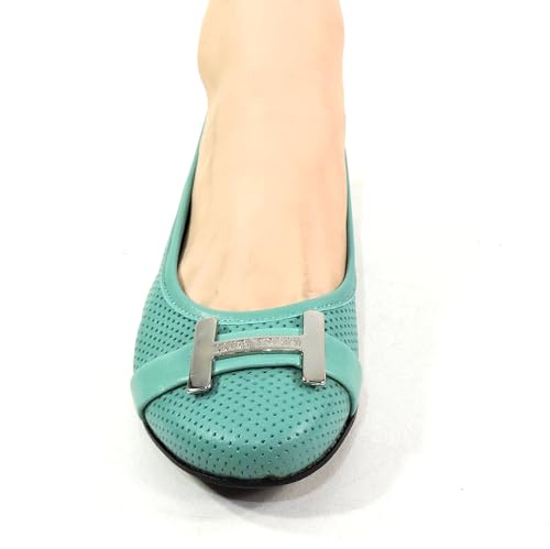 HOT ! Women's Perforated Leather Ballet Flats, Mint Green, Comfort Loafers with Metal H Buckle, Made in Italy.