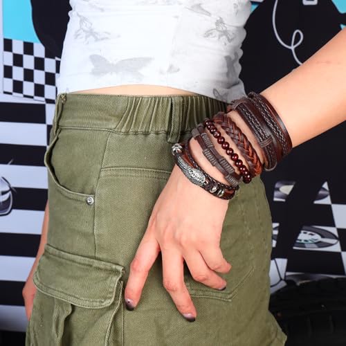 Manfnee 6-12PCS Braided Faux Leather Bracelet Punk Cuff Wrap Bracelets for Men Women Adjustable 5