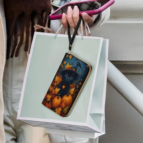 HOT ! Autumn Cat Pumpkins Women's Wallet Wristlet Zipper Purse with Hand Strap Travel Credit Card Holder for Daily Use Gifts