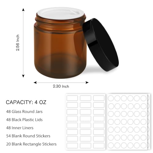 Tecohouse 4 oz Amber Glass Jar with Lids, 48 Pack Small Candle Jars with Lids & Sticker, Empty Cosmetic Containers for Sample, Cream, Spice, Lotion, Ointments Drying jar 4