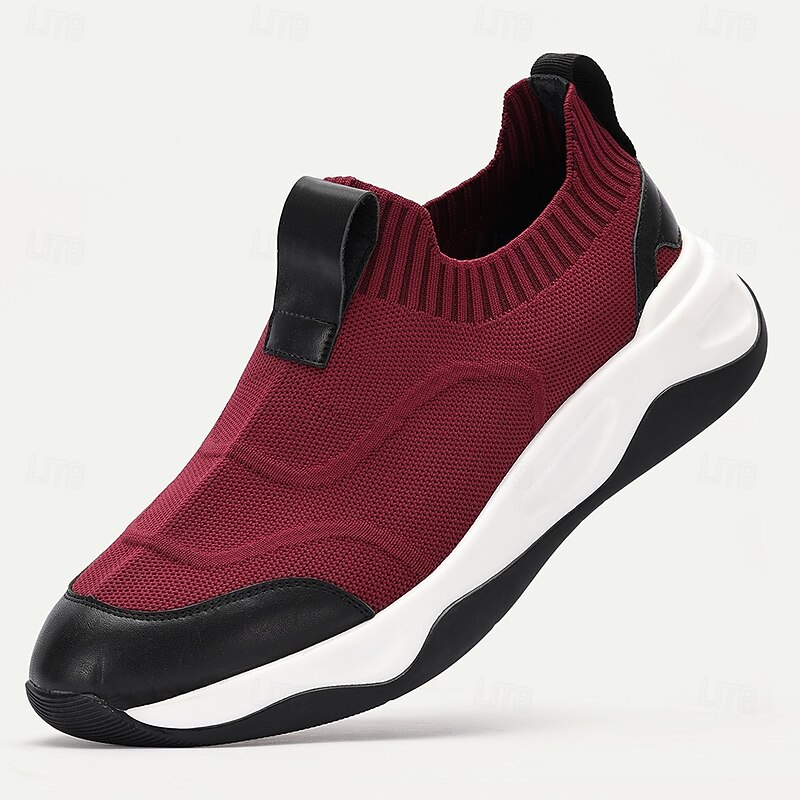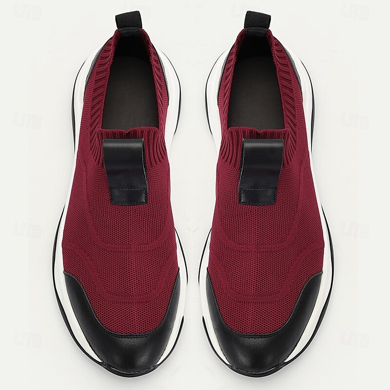 HOT ! Men's Premium Cowhide Slip-On Sneakers in Burgundy with Knit Upper, Comfortable & Stylish Design for Casual Wear