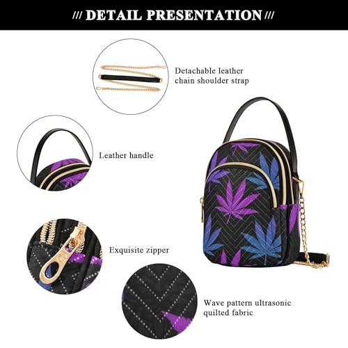 More information about Purple Blue Gradient Leaves Black Shoulder Handbags for Women Cute Animal Chain Strap Phone Wallet Handbag Quilted Ladies Tote Crossbody Satchel