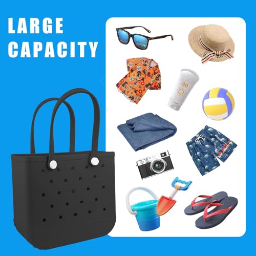• 🌈 Perfect Design: beach tote is lightweight but personalized tote bag, this spacious tote bag is designed with ventilation holes, rubber beach bag is available in 2 sizes, X-large:18.5 "L x 9.8 "W x 13.7 "H,Large:15 "L x 6 "W 12.5 "H,beach bag are made of durable EVA material with anti-tip feature and sturdy sides. rubber tote bag has a non-slip pattern on the bottom,