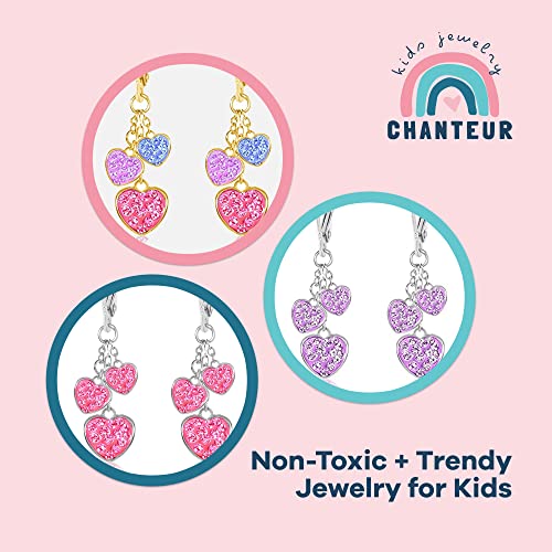 HOT ! Kids Hoop Earrings, Heart Earrings for Girls, Hypoallergenic Jewelry with 925 Silver Leverbacks in White or Yellow Gold Tone, Earrings with 3 Mini Hearts & Crystals, Small Earring with Hoops for Kids
