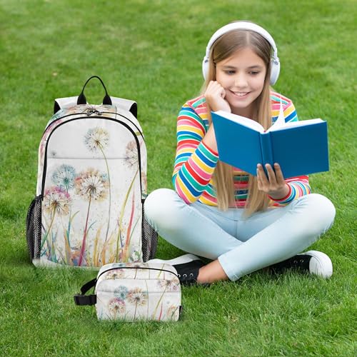 Watercolor Dandelions Flowers Backpack with Lunch Bag for Kids Boys Girls Travel School Backpack Set 3
