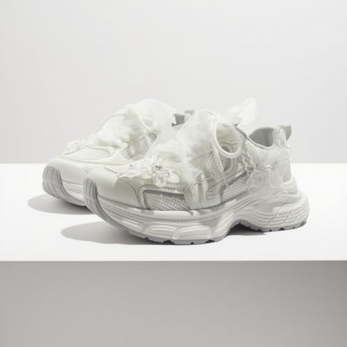 HOT ! Women's Cute White Sneakers, Pearl Accent Dad Shoes Breathable Mesh Upper Bow Detail Butterfly Laces Platform Fashion Athletic