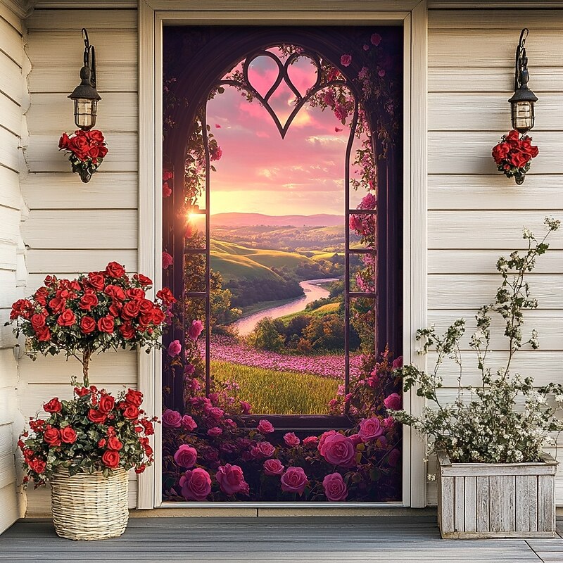 : The door cover showcases a romantic window view adorned with a heart-shaped design at the top, creating a warm and inviting atmosphere. The detailed artistry of the sunset landscape, with vibrant pink roses and a winding river, evokes a sense of tranquility and elegance.