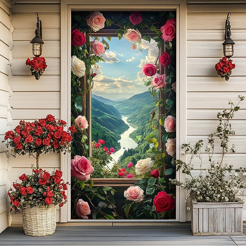 Wedding Outdoor Decorations Door Covers Door Tapestry Door Curtain Decoration Backdrop Indoor/Outdoor Door Banner for Front Door Farmhouse Window View Roses