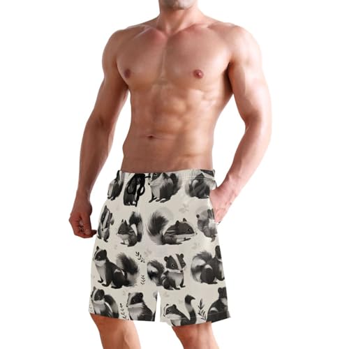 HOT ! Men's Swim Trunks Quick Dry Swimming Shorts with Pocket Cute Skunk Animals on Cream Swimsuit Trunks